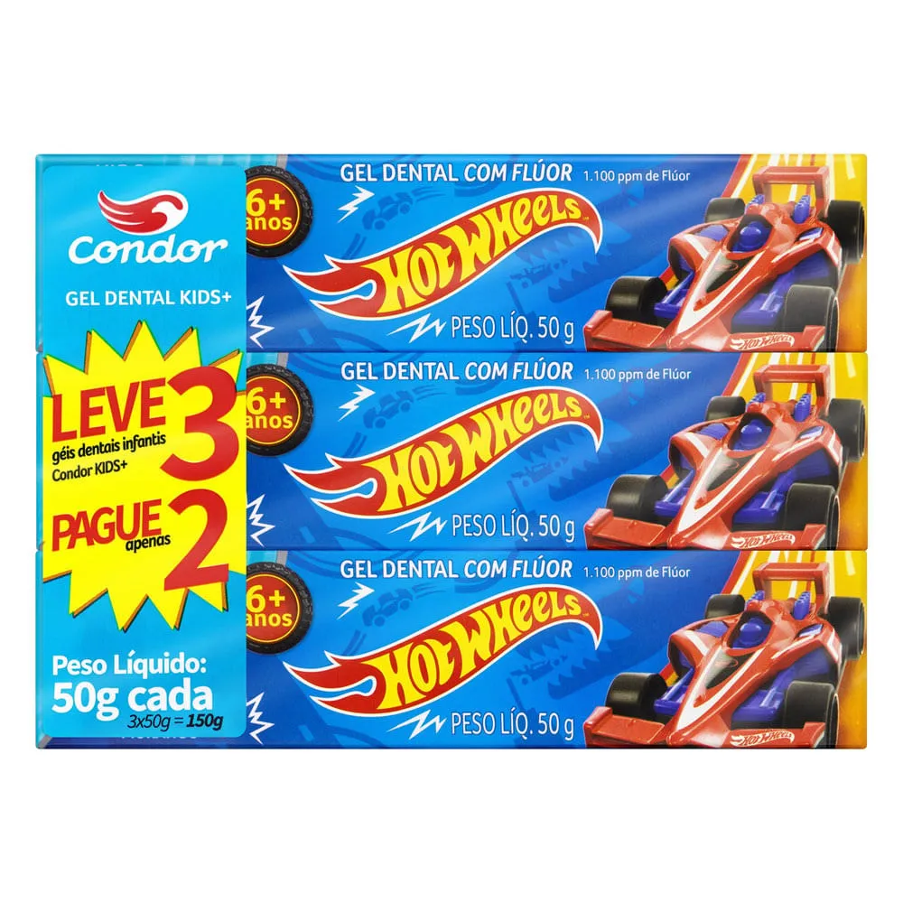 Promoção!Kit 3x50g Gel Dental Condor Kids+ Hot Whells com Flúor Morango