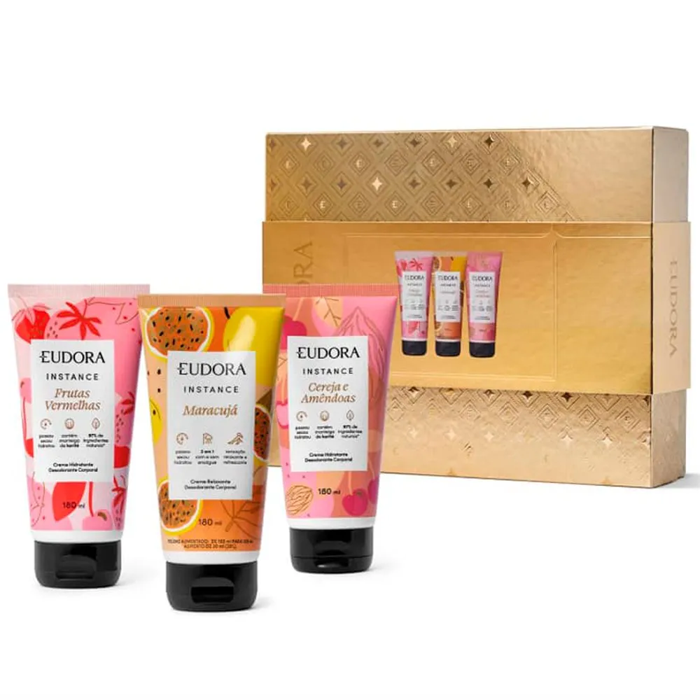 • Creme Hidratante Desodorante Eudora Instance Frutas Vermelhas Maracujá Cereja e Amêndoas 3x180ml