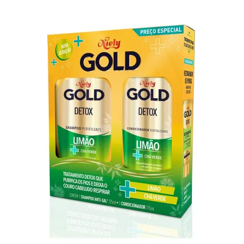 • Kit Shampoo 275ml + Condicionador Niely Gold Detox Limao + Cha Verde 175ml