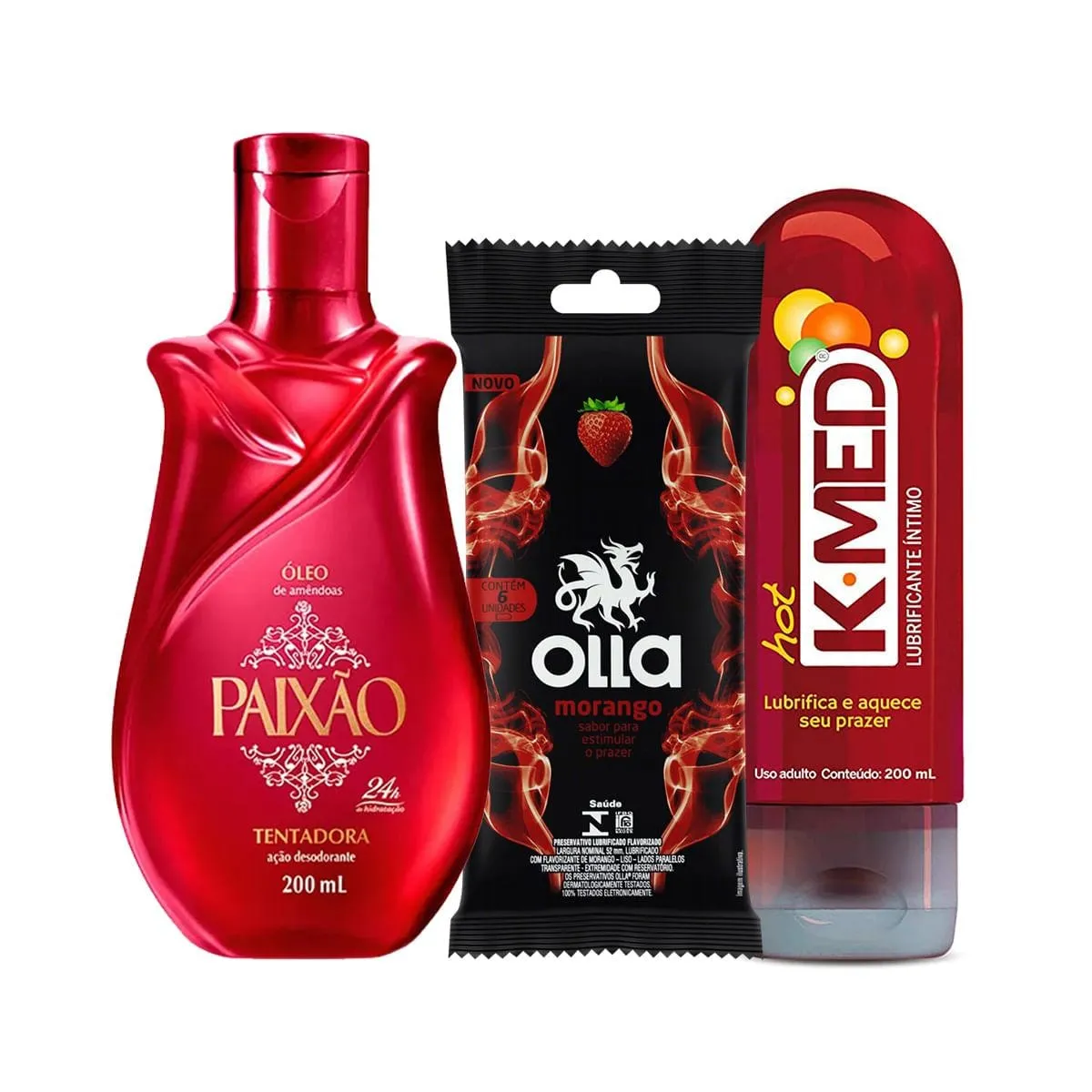Promoção!Kit Prazer Paixão Óleo Corporal de Amêndoas Tentadora 200ml + K-Med Hot Gel Lubrificante Íntimo 200g + Olla Preservativo Morango com 6 Unidades
