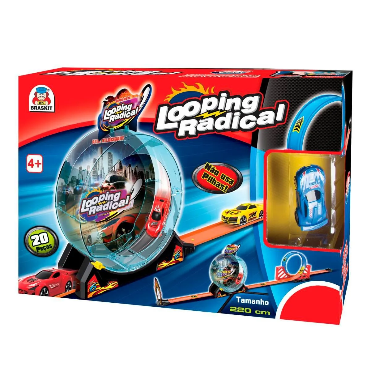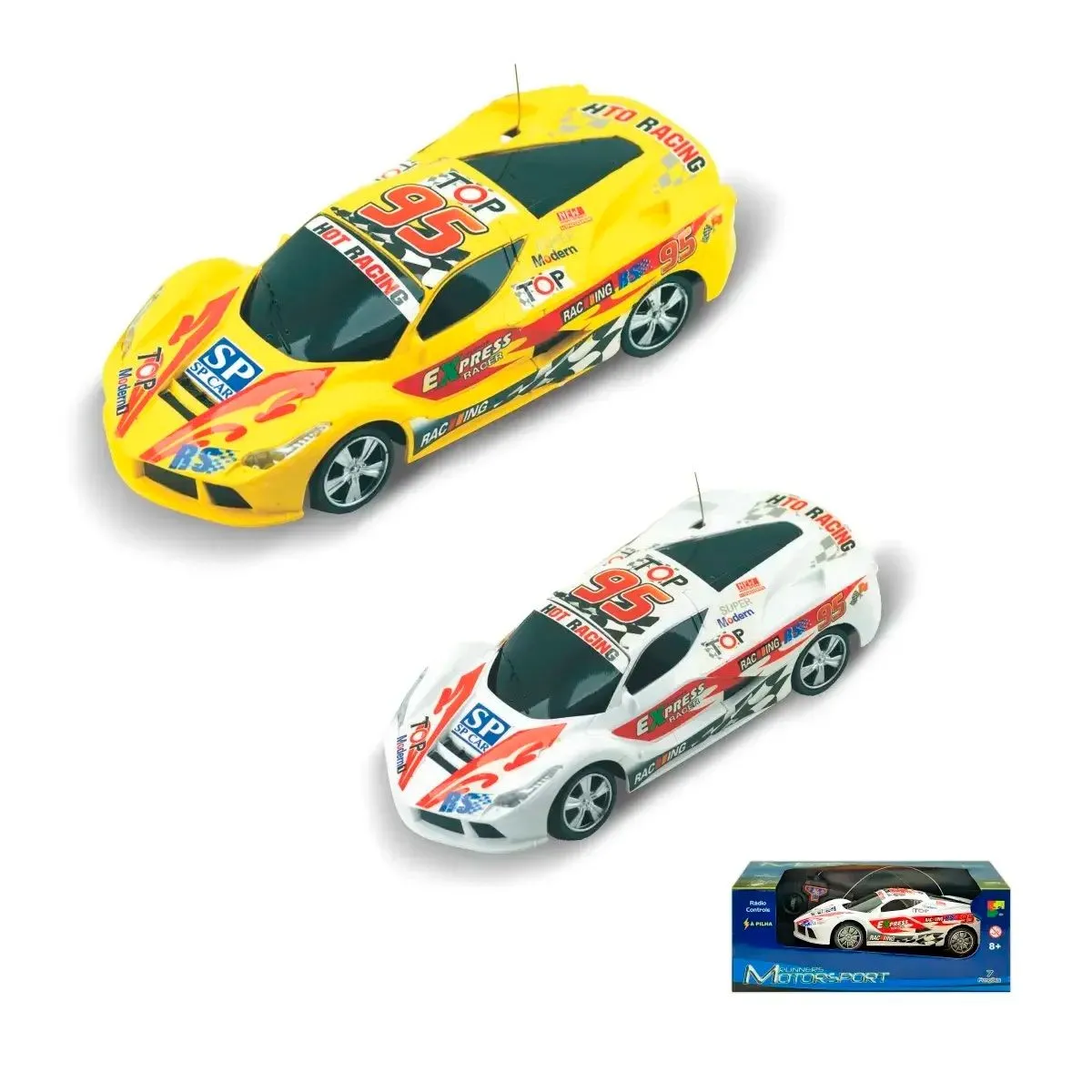Carrinho de controle remoto com 4 funções e luzes.