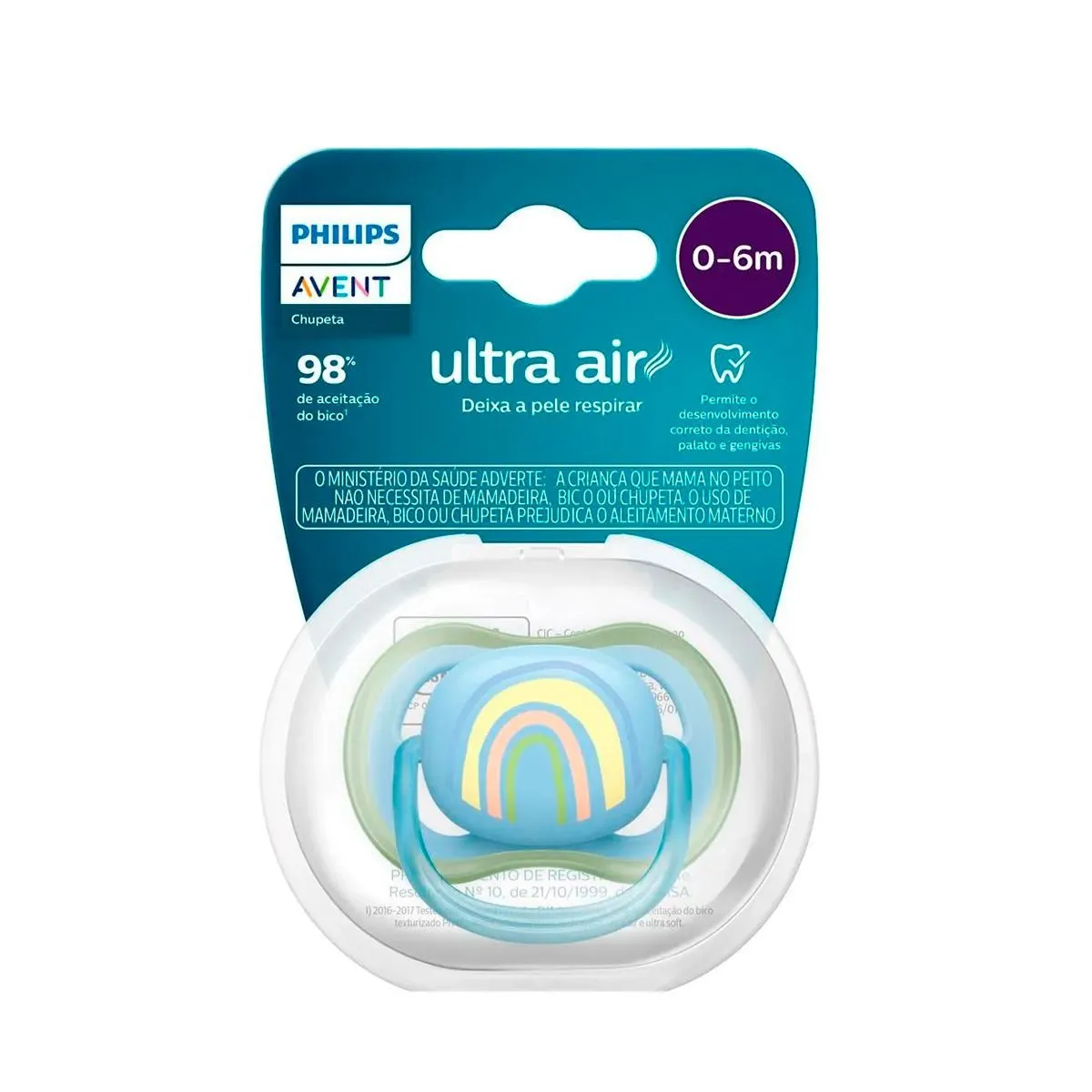 A Philips Avent Ultra Air é uma chupeta leve com entradas de ar que permitem que a pele do bebê respire enquanto ele a utiliza.