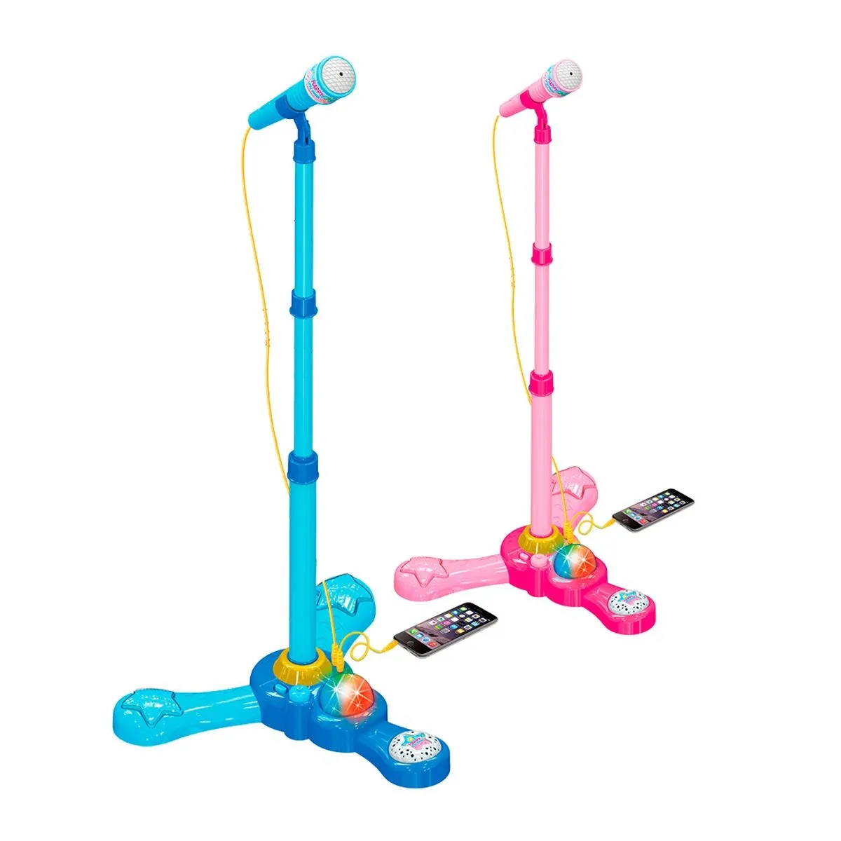 Microfone com pedestal e luzes coloridas. Para brincar de cantar e se sentir como uma estrela! Conecte seu MP3 player ou smartphone para cantar com as suas músicas favoritas (MP3 player e/ou smartphone não incluídos)!
