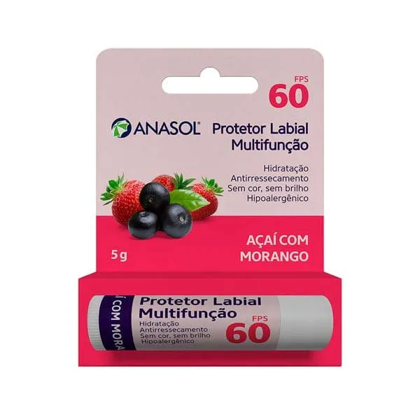 Com fator de proteção solar (FPS) 60, o Protetor Labial Anasol protege eficazmente contra os raios UVA e UVB, prevenindo queimaduras e o envelhecimento precoce dos lábios. Sua fórmula contém ingredientes hidratantes que garantem lábios macios e suaves. O aroma e sabor de açaí com morango adicionam um toque delicioso ao cuidado diário.